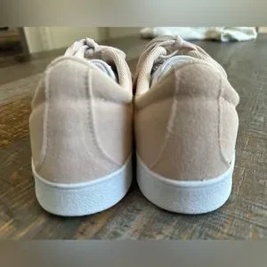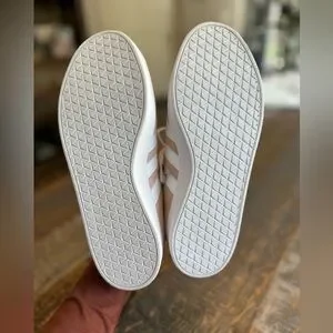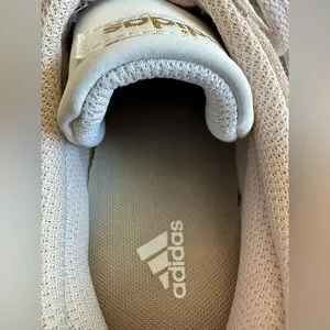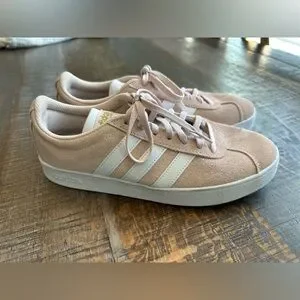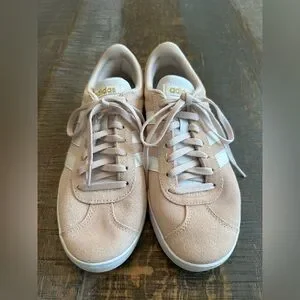 Stylish Adidas sneakers in pinkish beige with white accents. Comfortable and versatile for daily wear. Perfect for athleisure wear outfits. Great condition.