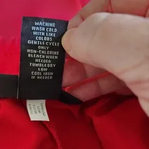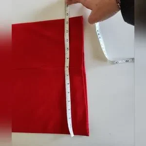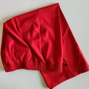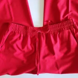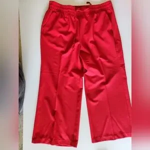 Vibrant red pants with elastic gathered waist. Smooth, lightweight fabric. Wide leg styling. Bold, saturated color for statement outfits.