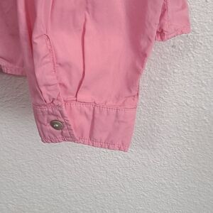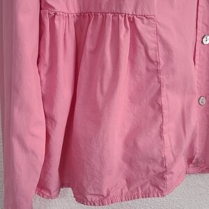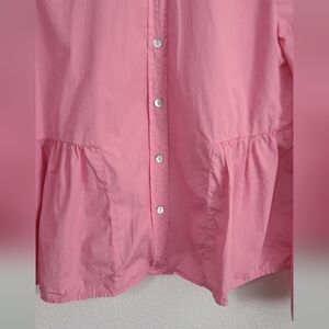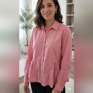 Lightweight pink button-front blouse with a soft peplum waist. Classic collar and long sleeves. Clean, simple silhouette for everyday wear.