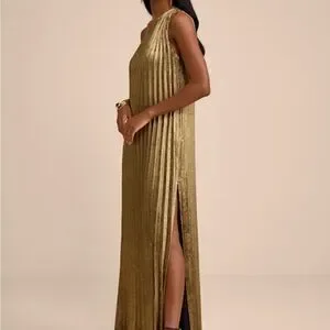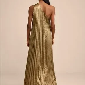 This dress is dripping with an ethereal essence that cannot help but be admired, thanks to pleated lurex-threaded fabric that effortlessly shines. The flowy A-line silhouette elegantly drapes the figure, featuring a chic one-shoulder neckline and sweeping maxi hem that sways with your every step. A sultry side slit completes the look. Hidden side zipper/clasp.