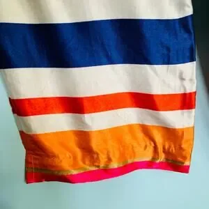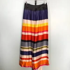 A stunning pair of pants in stripes of blue, yellow, orange, white, pink and green that are sure to turn heads! Pleated front with a wide leg, these pants can be worn out and about on the weekend or dressed up for a party or evening out! Belt loops, zipper fly with two metal clasp closure. Lightly worn, in excellent condition
