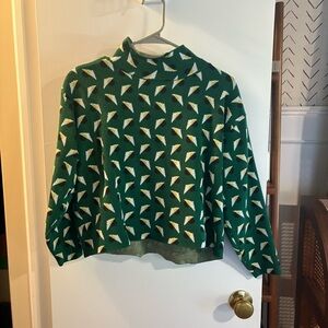 Maeve “The Carys” sweater. Green base with geometric white, yellow, and navy shapes. Long sleeves and a relaxed fit. Soft knit fabric. Stylish and eye-catching. Great used condition!