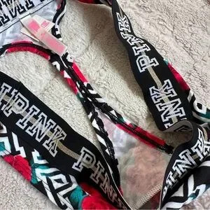 Details: Victoria's Secret Pink thong features a floral rose pattern on a black and white logo background. Thicker band, Minimal coverage. From the 2018 line.