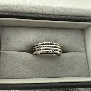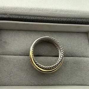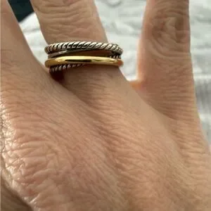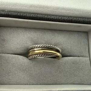 Stylish ring with a twisted silver and gold design. Perfect for any occasion.
