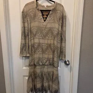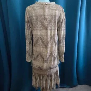 Design Details: One-piece dress, metallic gold/silver thread, drop waist silhouette, tiered pleated skirt, back zipper with button closure.