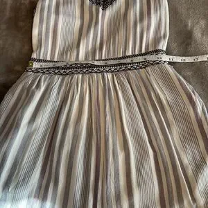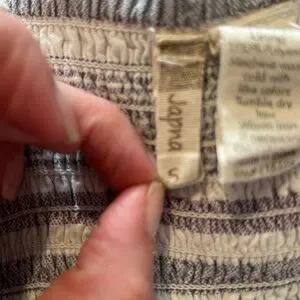 Japna shirts romper Size small Blue/gray/white stripes Navy stitching for details Elastic back Pockets Worn with lots of life left Priced to reflect wear
