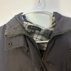 Charcoal utility jacket with front pockets. Features zip and button closure. Ideal for casual wear.