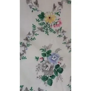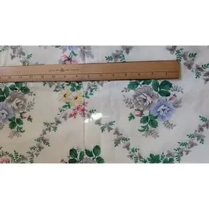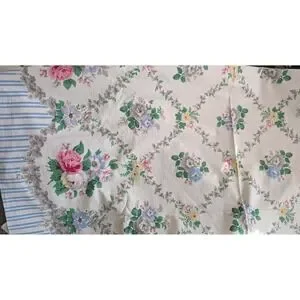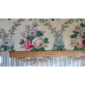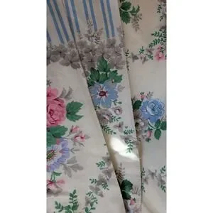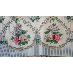 Vintage Floral Trellis Fabric Blue Stripe Border Pink Roses Cotton 132"x53"