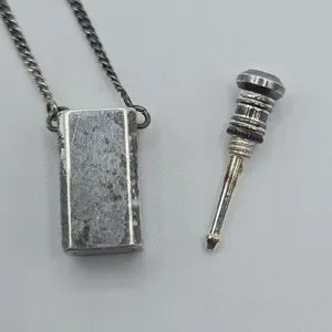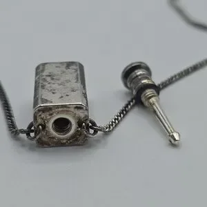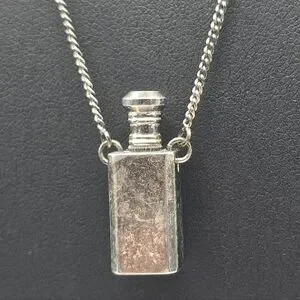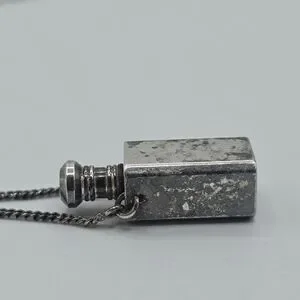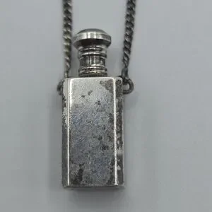 Vintage silver tone pendant necklace with a small, rectangular perfume or scent bottle. The top unscrews and reveals a slim applicator/dabber stem. The worn finish gives it a slightly moody feel with a subtle apothecary/potion bottle vibe.