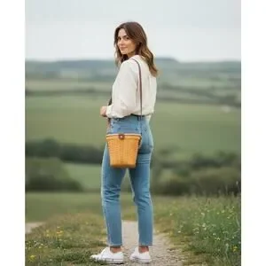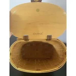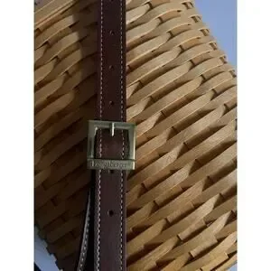 The Large Saddlebrook Longaberger basket purse is the perfect addition to any collection. So adorable equestrian natural sustainable vibes. Purse has a wooden lid with magnetic leather tab closure and adjustable leather strap with brass hardware. Crafted using traditional weaving methods, this large Saddlebrook purse features a distinctive brown hue and a complex weave design. It stands just over 9 1/2 inches tall and 9 1/4 inches wide, making it perfect for carrying small items. This classic basket is versatile for any event.