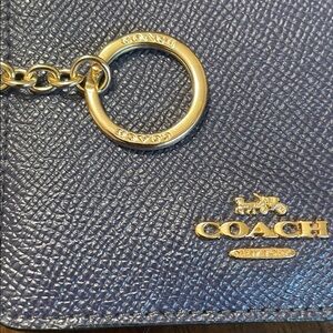 Sophisticated dark blue leather wallet with attached keychain. Accented by gold Coach emblem.