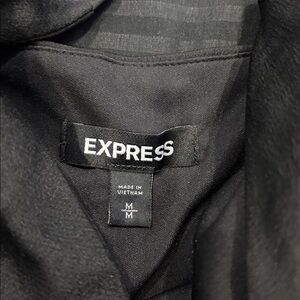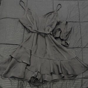 Elegant black slip dress by Express. Thin spaghetti straps. Flowy tiered ruffle skirt. Removable waist tie for a defined silhouette.