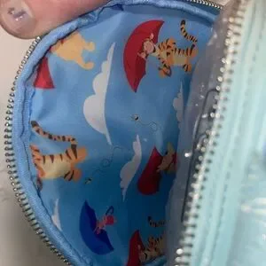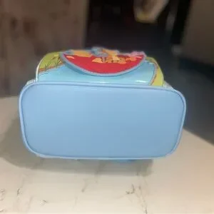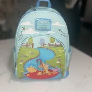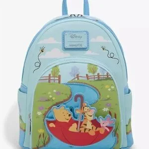 Pack up for a rainy day with this Winnie the Pooh mini backpack! Featuring an applique of Tigger, Piglet, and Pooh riding in an umbrella, this detail moves up and down across the river scene. With embroidered bees, this backpack is perfect for a day at the Disney Parks.