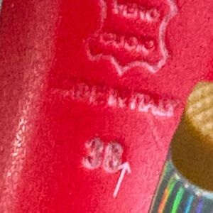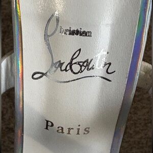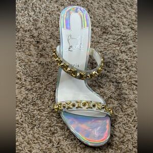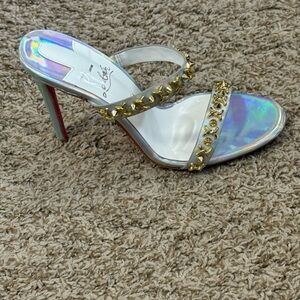 Iridescent holographic upper with two studded straps. Gold-tone studs across the straps for eye-catching detail. Signature red sole and slender high heel. Sleek open-toe slide silhouette.