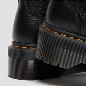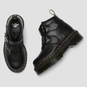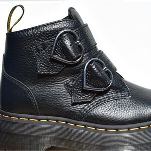 Dr Martens Devon Heart black milled nappa leather platform boots with double heart buckle straps, chunky lug sole, iconic yellow welt stitching, rare sold out style. Condition new without box, size 8. Ships fast from Kourtney’s Kloset.