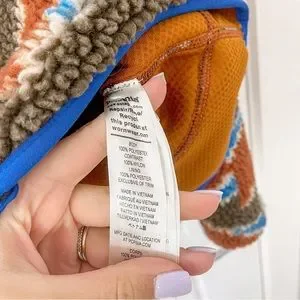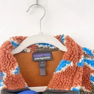 Good condition. True color shown in last photo. Size xs. Rare pattern print. Hiking outdoors. Zip up. Orange blue and brown.