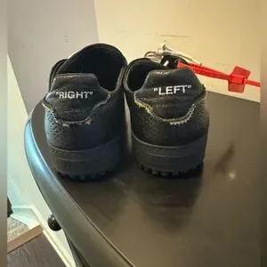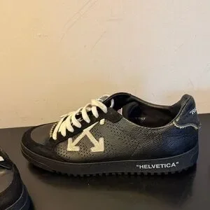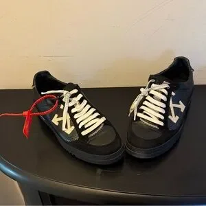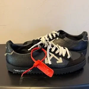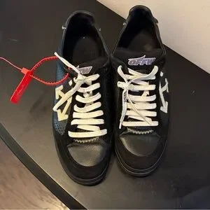 Stylish Off-White sneakers in classic black and white with a bold red accent—perfect for a modern, streetwear look.