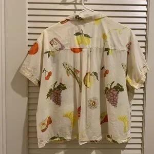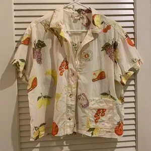 Fruit, veggie, and snack print button down boxy fit top for beach or casual wear
