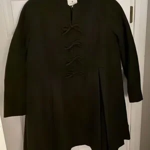 Tuckernuck, Black Blair Bow Coat Dress, New With Tags, Size L. This elegant mini dress is designed with a classic relaxed, oversized A-line silhouette and features distinctive four bow detailing on the bodice. Features a notched neckline with long dolman sleeves, flattering pleated skirt with a mini-length hem. Pullover styling, inseam pockets and is fully lined and feels like a thick structured wool coat. Measurements taken with item laying flat: underarm to underarm 20 inches, waist 19.5 inches, dress is 33 inches long.