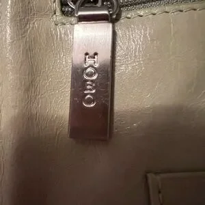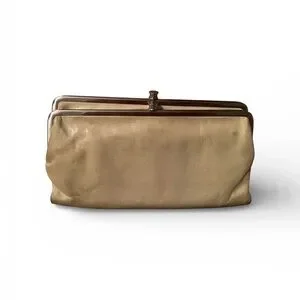 Beautiful HOBO vintage-style leather clutch/wallet in a soft beige/taupe tone. Features a classic kisslock frame closure and a spacious accordion interior with multiple compartments, card slots, zip pocket, and ID window—perfect for organizing essentials.
