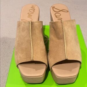 Chunky platform clog mules with tan suede upper. Studded trim along the sides for subtle detail. Wood-look block heel for stable lift. Slip-on style with cushioned insole.