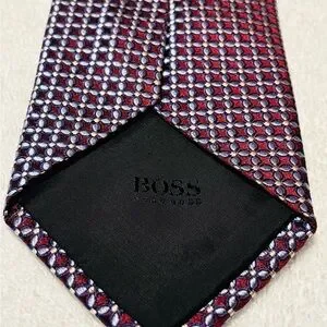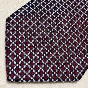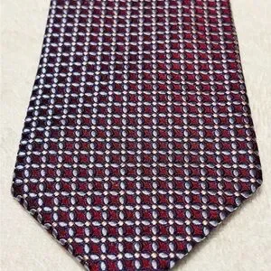 Refined silk tie with repeating geometric motif. Rich burgundy base with navy and silver accents. Smooth texture and subtle sheen. Sharp, modern look for dress and business wear.