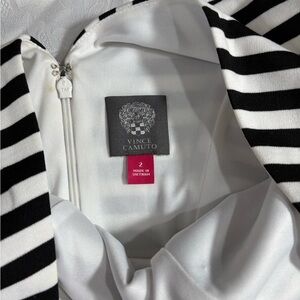 This Vince Camuto dress is a classic sheath style in a black and white knit fabric with striped pattern. It features a crew neckline and sleeveless design, suitable for both casual and formal occasions. The dress is a size 2 and has a short length, making it a versatile piece for winter, summer, fall, and spring seasons.
