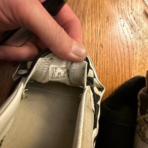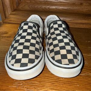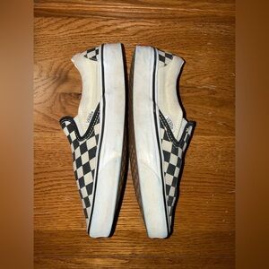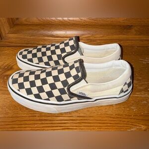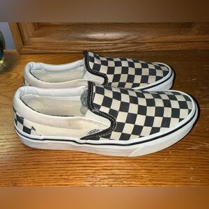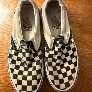 Vans Men’s size 5 1/2” classic slip-on silhouette with checkerboard canvas top. Elastic side accents for easy wear. Low-profile rubber sole for everyday comfort. Timeless skate-inspired style. They are in gently worn condition.