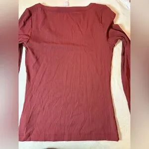 Fitted ribbed knit top with crew neckline. Smooth, stretchy fabric for a sleek fit. Versatile layering piece for casual or dressed-up looks. Look at measurements. Can fit medium easily
