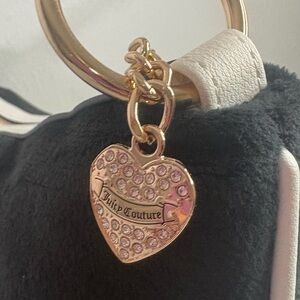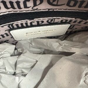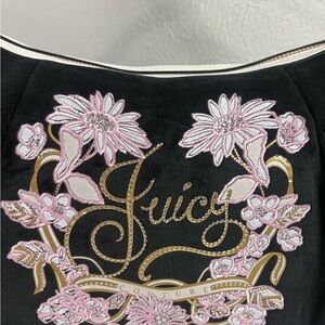 Juicy Couture velvet hobo bag with pink floral embroidery. Gold-tone charms and logo accent the front. Single shoulder strap for easy carry. Elegant black and pink colorway for feminine style.
