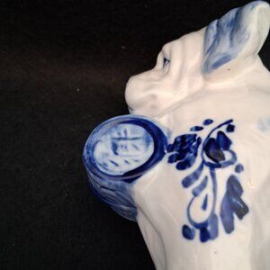 The underside is marked “Delfts Blue” and “Hand Painted,” and the piece includes a hollow base with a stopper opening. While inspired by Dutch Delftware, this figurine was produced as Delft‑style export décor, making it a lovely collectible for fans of blue‑and‑white ceramics, farmhouse décor, or whimsical animal figurines.