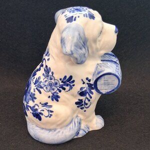 Bring classic blue‑and‑white charm to any space with this hand‑painted Delft Blue–style ceramic dog coin bank. This vintage piece features a beautifully detailed sitting dog holding a small barrel with a coin slot, decorated in traditional cobalt floral and scrollwork accents. Each brushstroke shows the character of hand‑applied paint, giving the figurine a warm, artisanal feel.