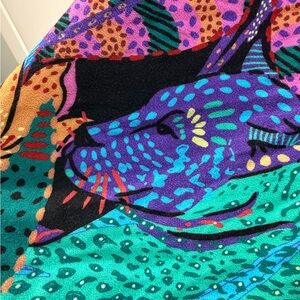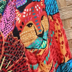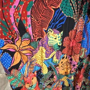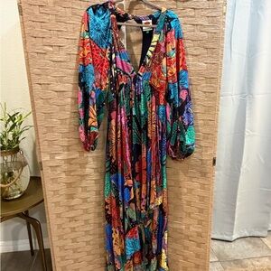 Bold multicolor floral print with a deep V-neck. Long puff sleeves and a flowing maxi skirt. Lightweight, airy drape for easy movement. Eye-catching mix of vibrant hues for statement style.