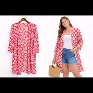 Lightweight LOFT Outlet floral kimono cardigan featuring a vibrant red base with white and blue floral print. Flowy, open-front design makes it the perfect layering piece for spring, summer, or vacation outfits.