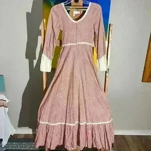 Gunne Sax By Jessica Vintage 70s Check Prairie Cottagecore Gingham Boho Renaissance Medieval Tiered Corset Bodice Womens 5 XXS Dress