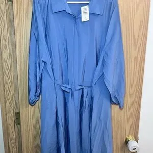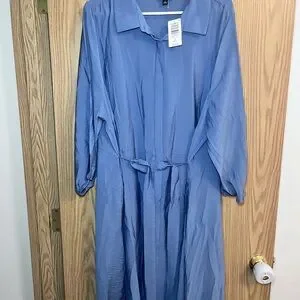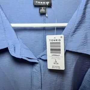 Soft dusty blue shirt dress by torrid. Long sleeves and a pointed collar. Self-tie waist for shape. Flowing, lightweight fabric. Easy, polished look.
