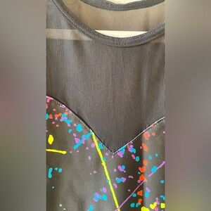 Bold American Apparel bodycon dress featuring a vibrant neon paint splatter print on a sleek black base. Designed with a flattering fitted silhouette and sheer mesh neckline for an edgy, statement look.
