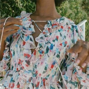 In floaty silk georgette, the Marlene Dress features a ruffle-trimmed collar with two delicate ties, a gathered bodice with an invisible side zipper, generous full-length sleeves trimmed with ruffles at the cuffs, and cascading ruffles that extend down the front. A ruffle at the waist creates a subtle peplum effect, giving way to an ankle-grazing A-line skirt with a center slit and a ruffled hem.