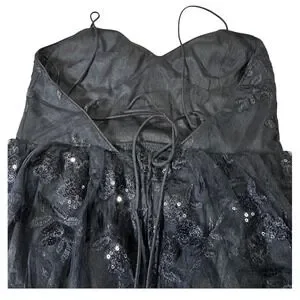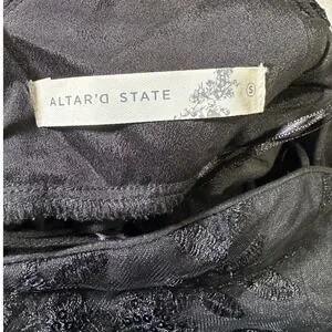Keywords: Altar State dress, black maxi dress, floral applique, tiered skirt, tulle overlay, evening gown, formal dress, special occasion, cocktail dress, glamorous, feminine, elegant, party dress, whimsy, goth