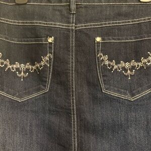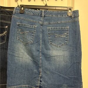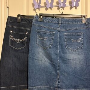 Stylish denim skirts featuring elegant embroidery. Perfect for casual outings. The light skirt has two stains in last picture but it’s definitely not a deal breaker at all and is perfect for going out still.