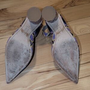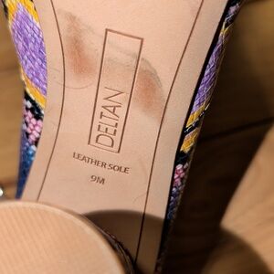 Stylish multicolor snakeskin-print pumps with a comfortable round block heel. Pointed toe and ankle strap with buckle for a secure fit. Vibrant blue, yellow, purple and pink tones create a bold, fashion-forward look. Perfect for dressing up any outfit. In excellent condition worn once.