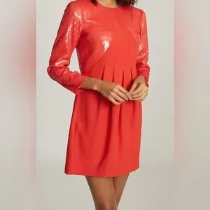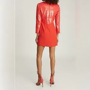 Coral mini dress with sequin-covered upper back and long sleeves. Smooth A-line skirt for a sleek silhouette. Eye-catching for evening events.