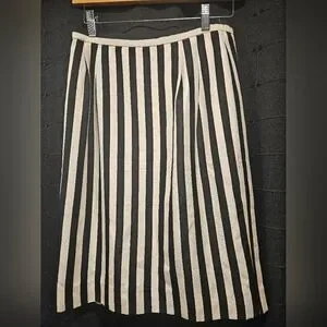 Elevate your wardrobe with this sophisticated vintage Saks Fifth Avenue skirt. Crafted from luxurious 100% silk, this piece features a timeless black and cream vertical stripe pattern that creates a chic, elongated silhouette.