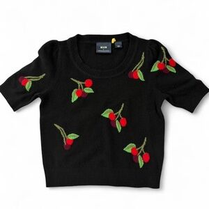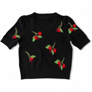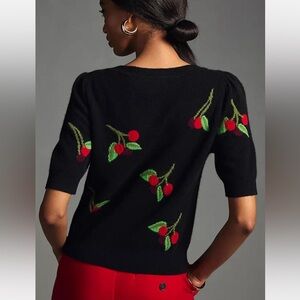 Anthropologie Maeve Puff-Sleeve Cashmere Jumper XS Black with Cherry Print