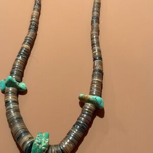 Vintage heishi and turquoise choker necklace. 18" long. The shell is 8mm heishi. The center stone is 3/4" long, southwestern, from the 1970’s.