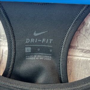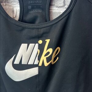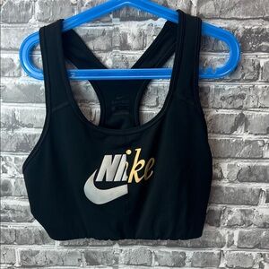 Sleek black sports bra with gold Nike logo. Ideal for active wear. Used but in great shape. Size large.