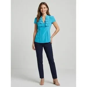 *Banana Republic silk blouse in a vibrant turquoise blue features a sophisticated tiered ruffle neckline and a flattering peplum-style waist. Crafted from 100% silk, this short-sleeve top offers a luxurious feel with a slight sheen, perfect for professional settings or elevated casual wear. The design includes a split V-neckline and subtle pleating at the waist to create a tailored silhouette.