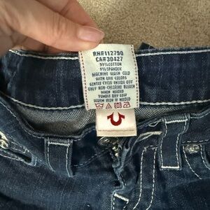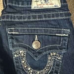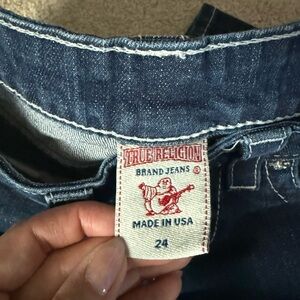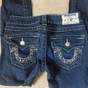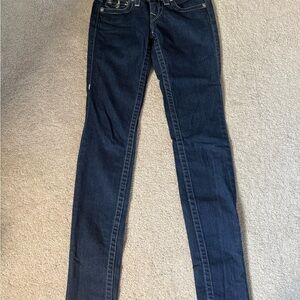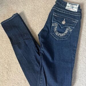 Vintage Y2K True Religion Jeans sz 24. Circa 2009-2010. Stylish low rise, dark blue skinny jeans. Features signature embellished back pocket design. Inseam measures 34” (has never been hemmed, original length). In excellent condition. Only flaw is a few rhinestones has fallen off during washing.