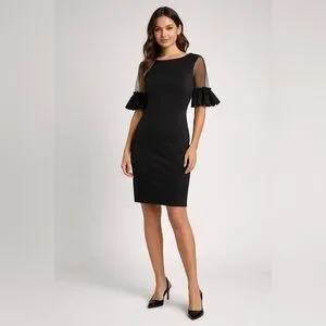 Chic black bodycon mini with sheer short sleeves. Tiered ruffle cuffs add playful texture. Clean crew neckline for a polished look. Sleek silhouette ideal for evening events.