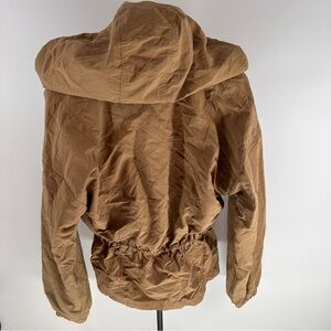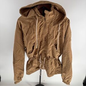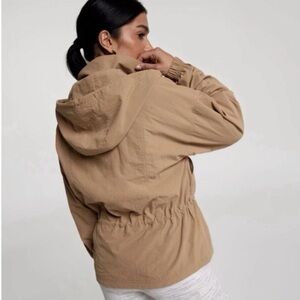 Stylish utility jacket with a hood. Features adjustable drawstring waist. Perfect for everyday wear.